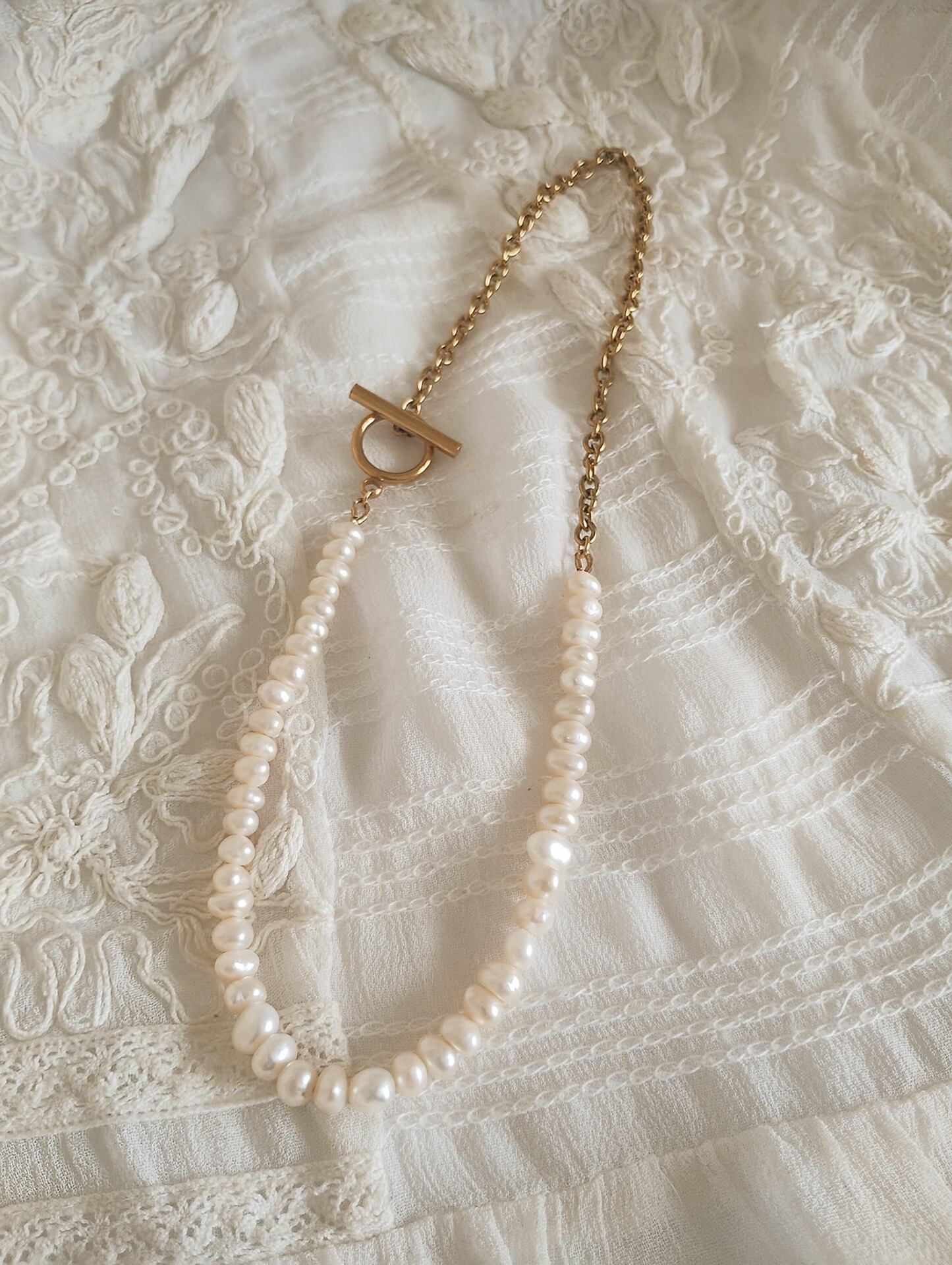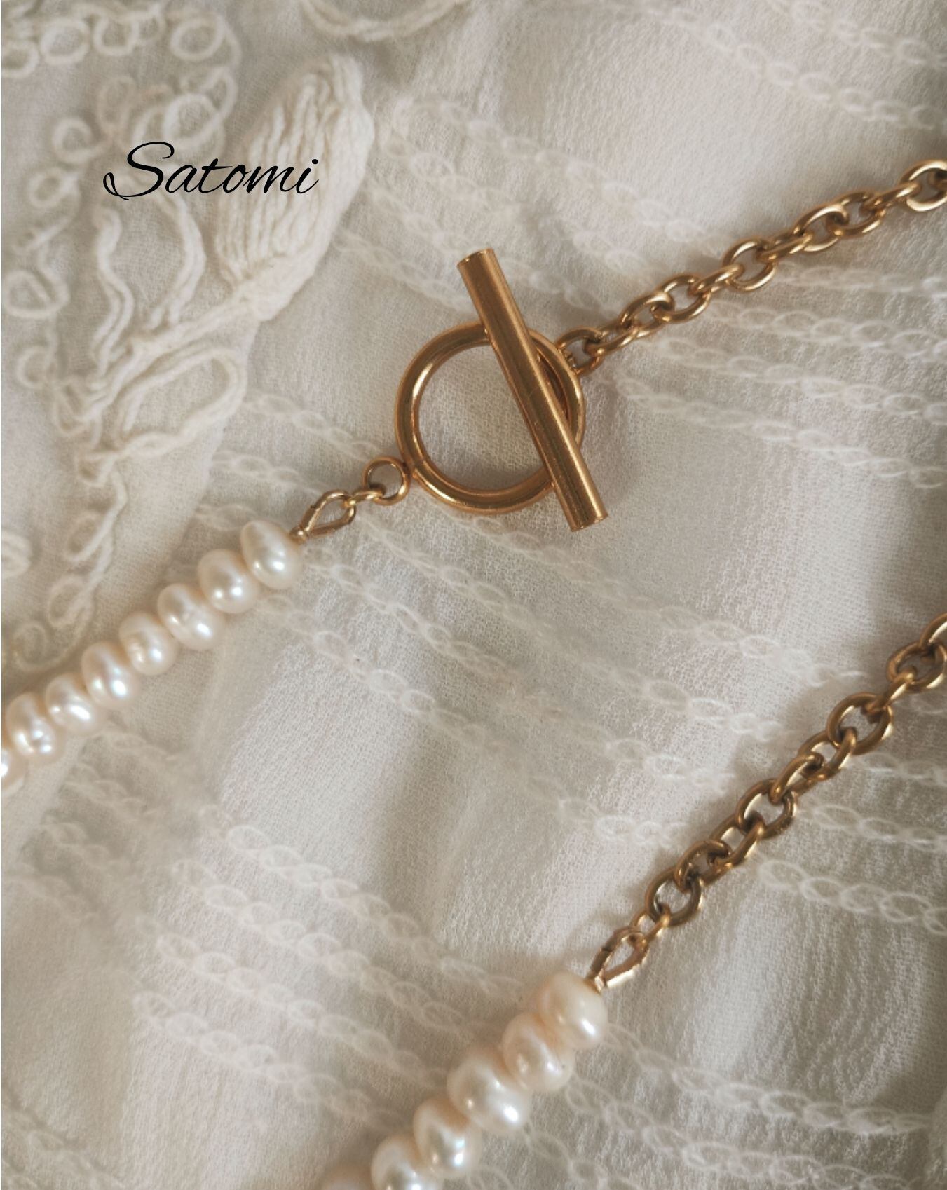 艶のあるパールに太目のチェーンを添えて上品でありながらカジュアルな感じに仕上げました。