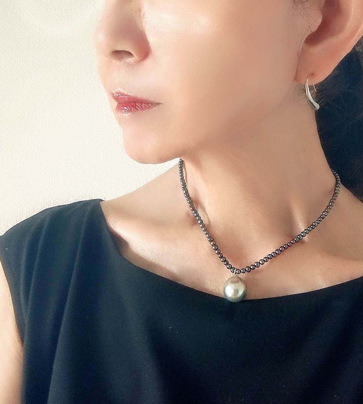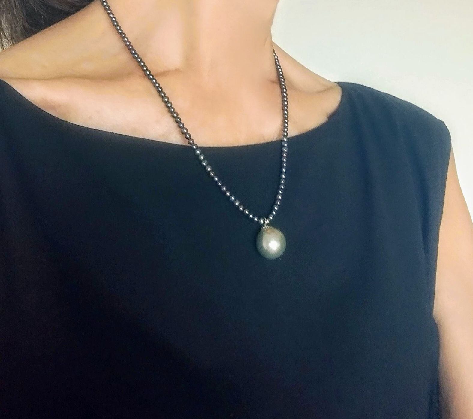 小粒のブラックパールにグレーがかった薄緑の艶感のとても良い南洋真珠を添えた高級感のあるネックレスです。