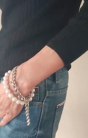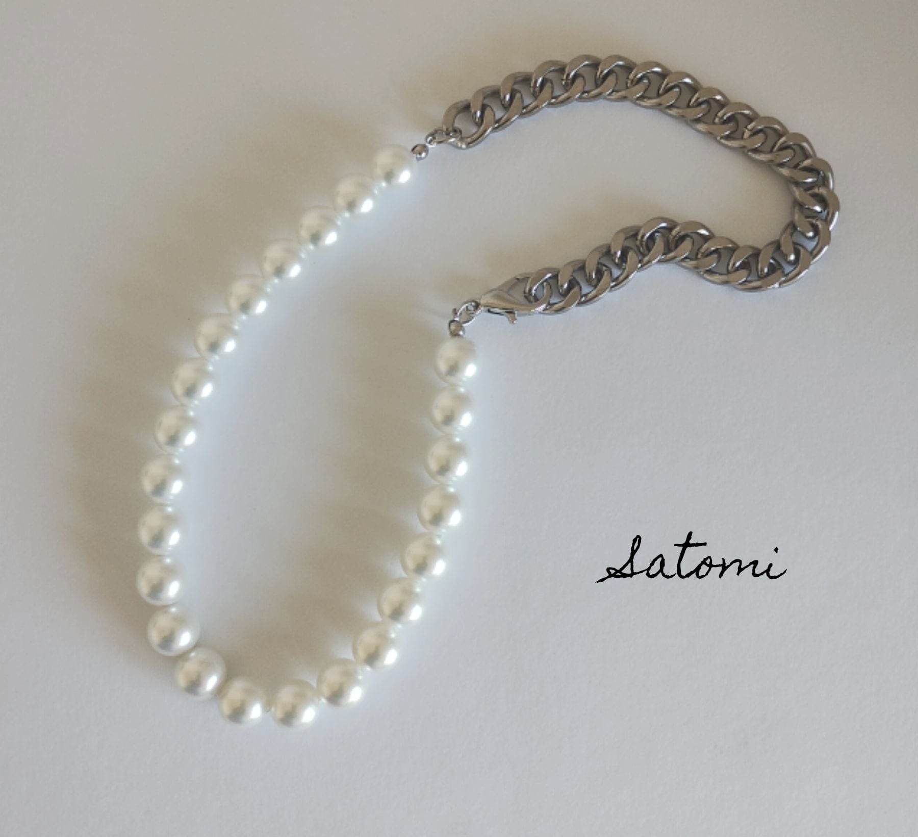 ボリュームのあるチェーンに1cm玉の大きなパールを繋げた存在感のあるネックレスです。