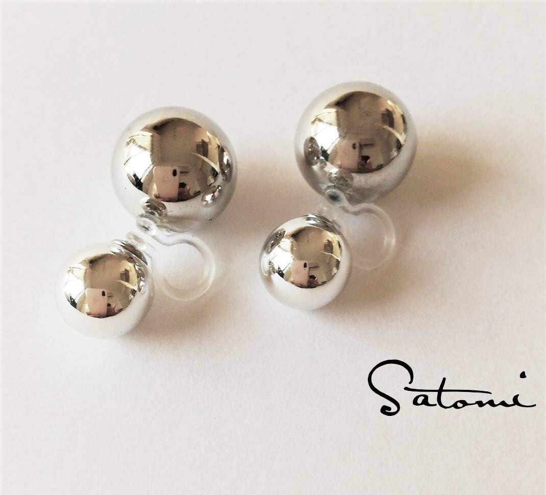 シルバーボールの大、小を前に着けたり後ろに着けたり出来る2wayタイプのイヤリングです。